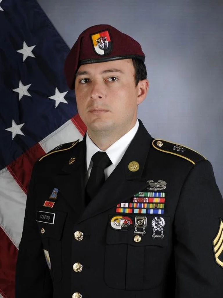 Conrad’s awards and decorations include Meritorious Unit Commendation (OLC), Army Commendation Medal (2 OLC), Army Achievement Medal, Army Good Conduct Medal (2), National Defense Service Medal, Afghanistan Campaign Medal, the Global War on Terrorism Service Medal, Noncommissioned Officer Professional Development Ribbon (2), Army Service Ribbon, Overseas Service Ribbon (2), NATO Medal, Combat Action Badge, Basic Parachutist Badge, and Driver and Mechanic Badge.